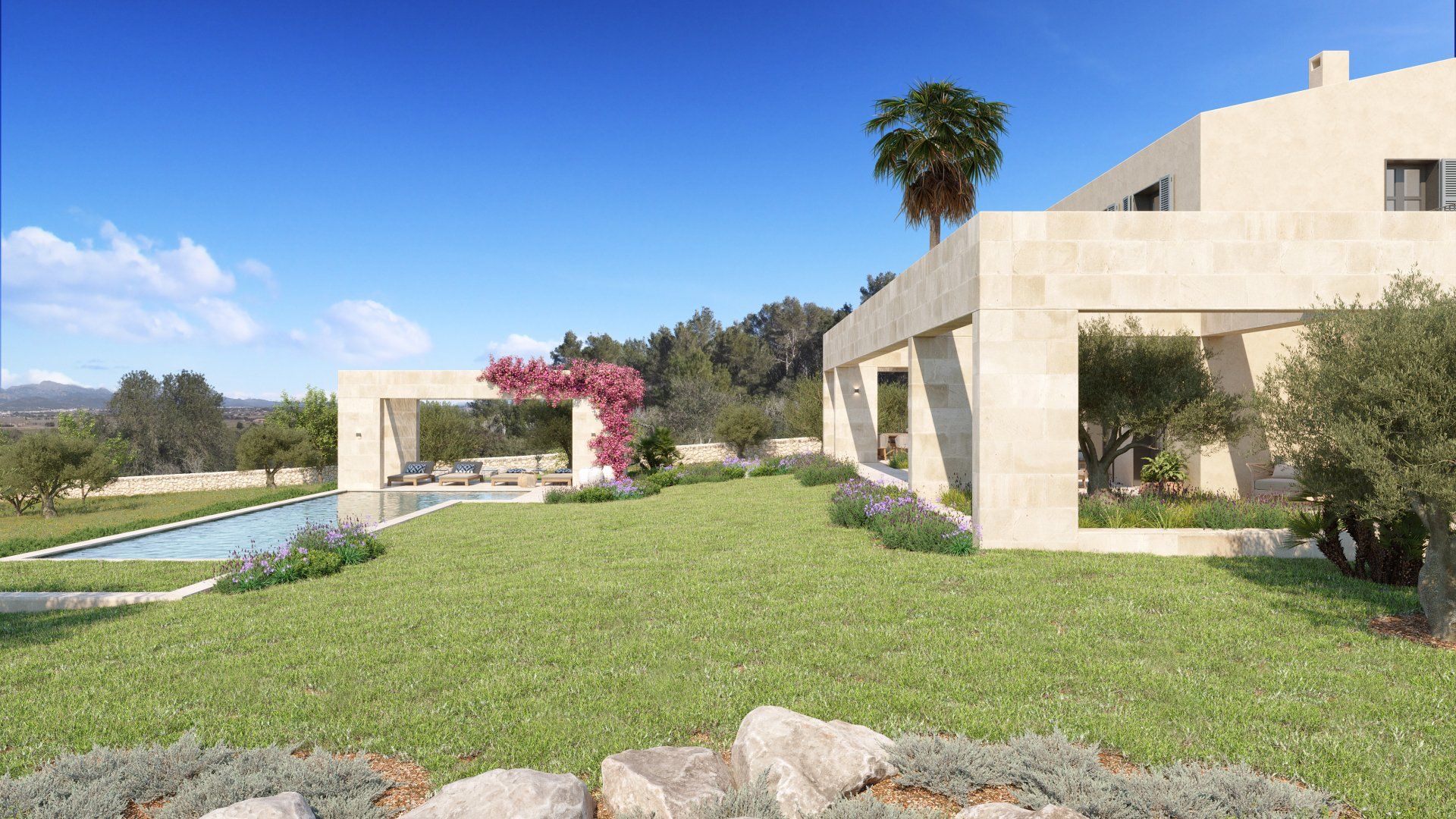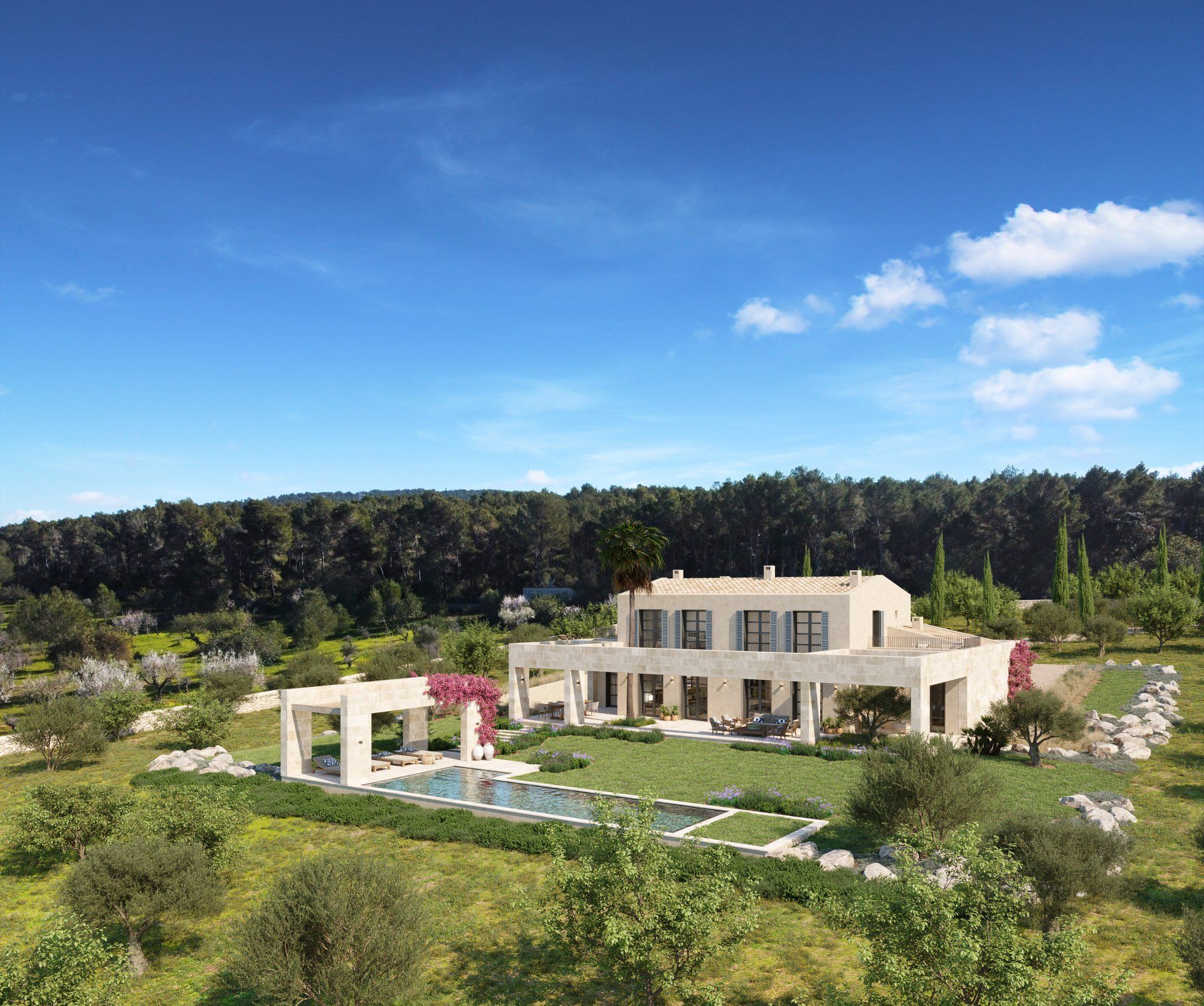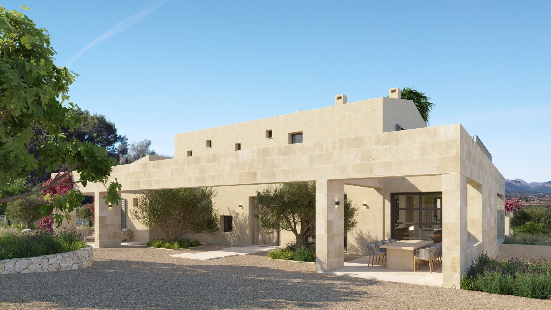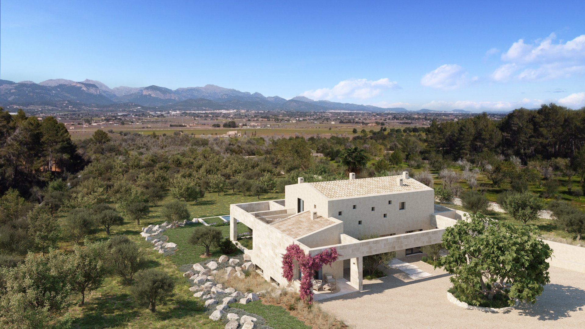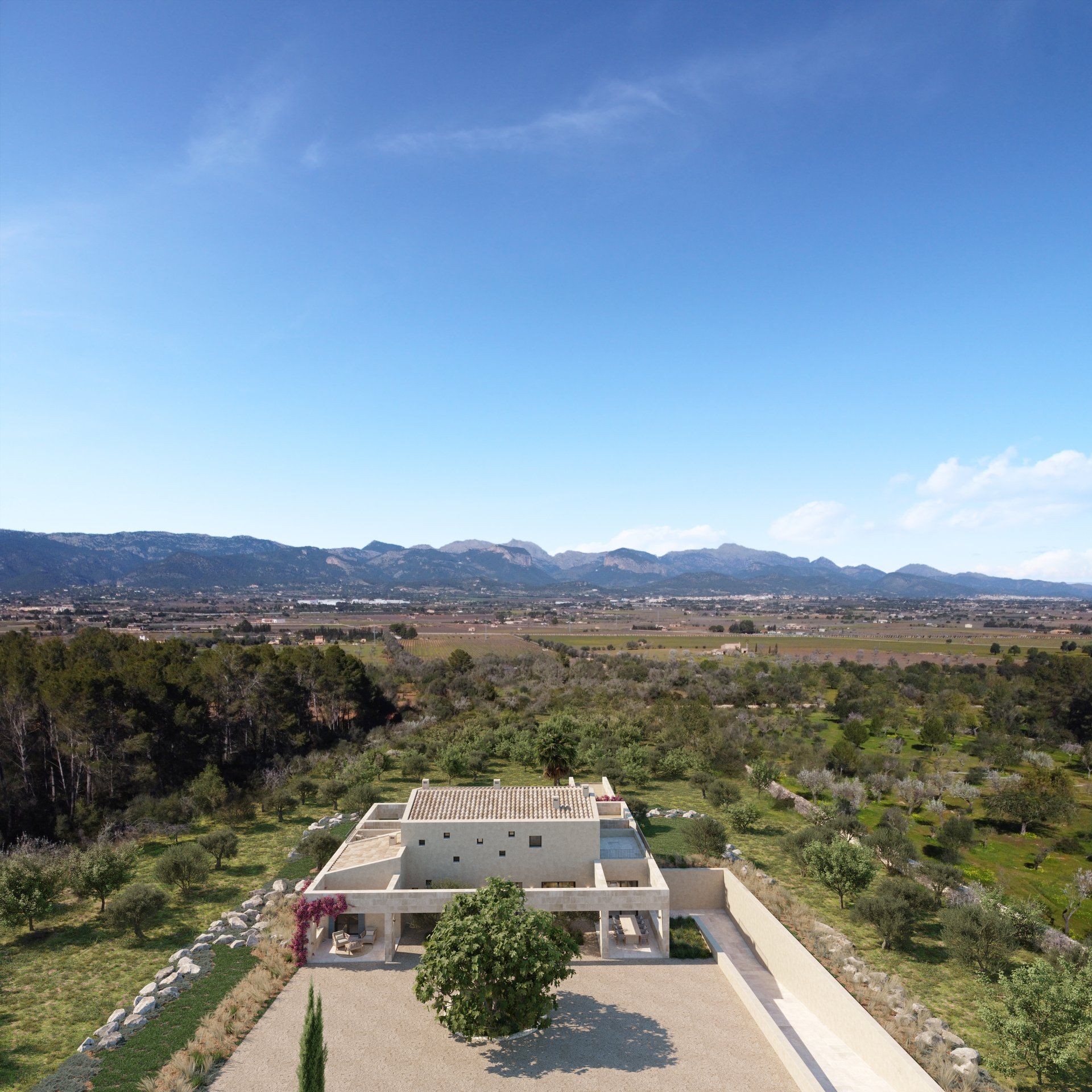 Quietly hidden in the country side, just 6 minutes away from the center of the village, Villa Santa Maria will offer spectacular views to the Tramuntana mountain range. The large plot of 15400m2 offers absolute tranquility, in a typical Mallorcan rural atmosphere, while being only 16 minutes away from the center of Palma, and 20 from the international airport.