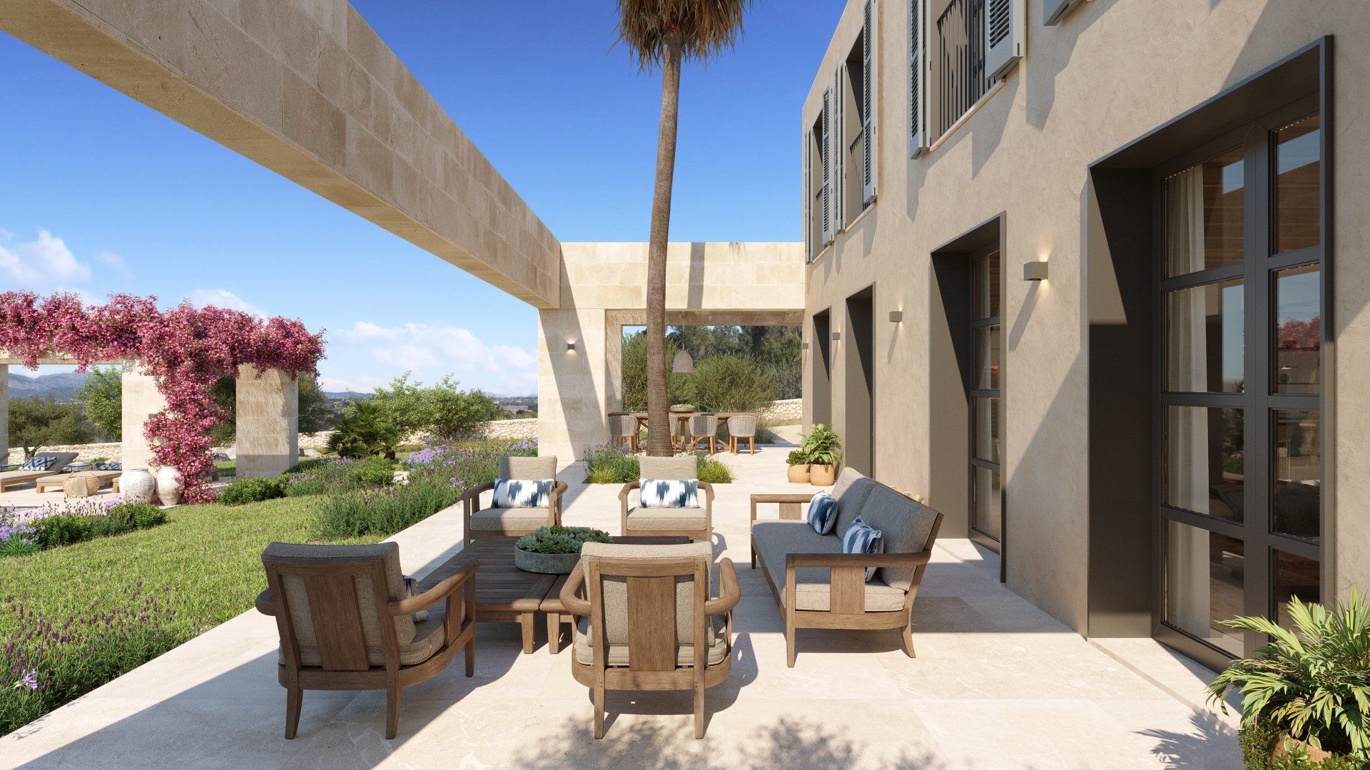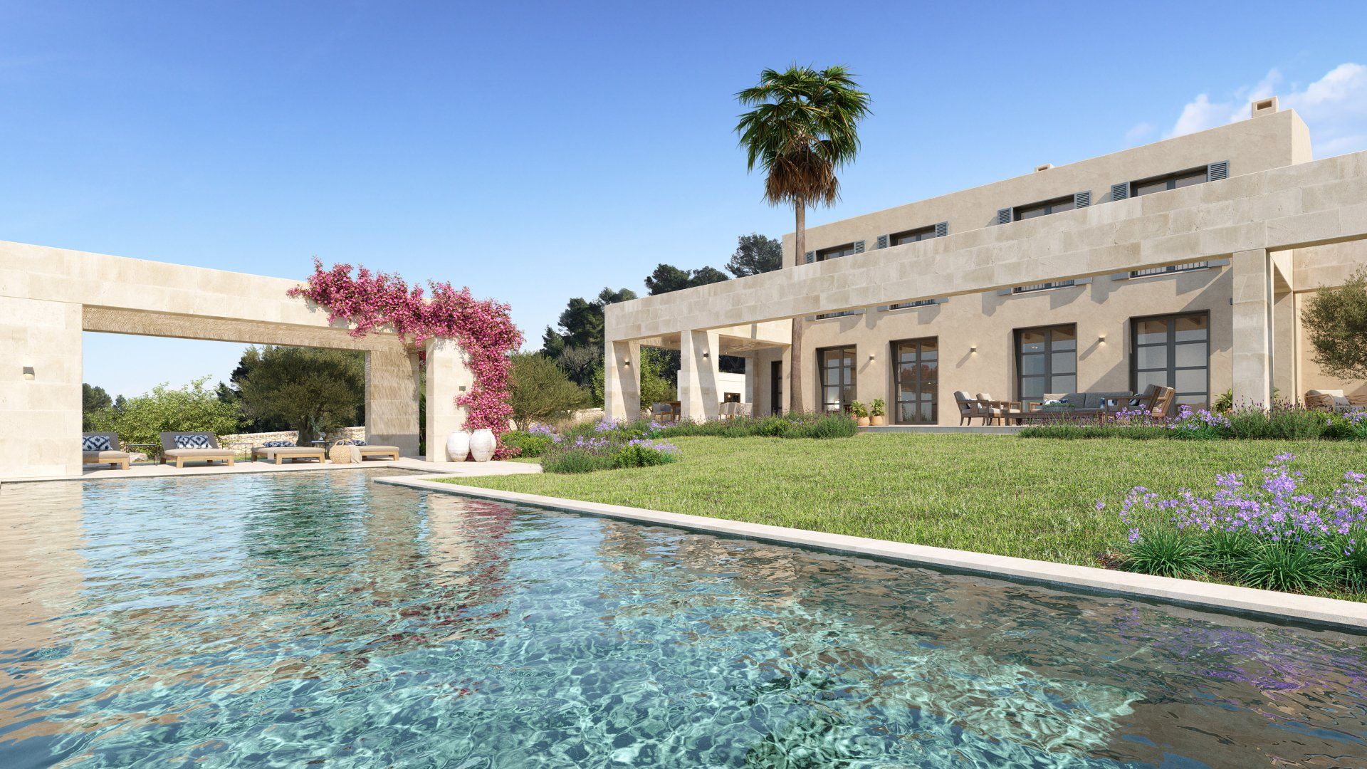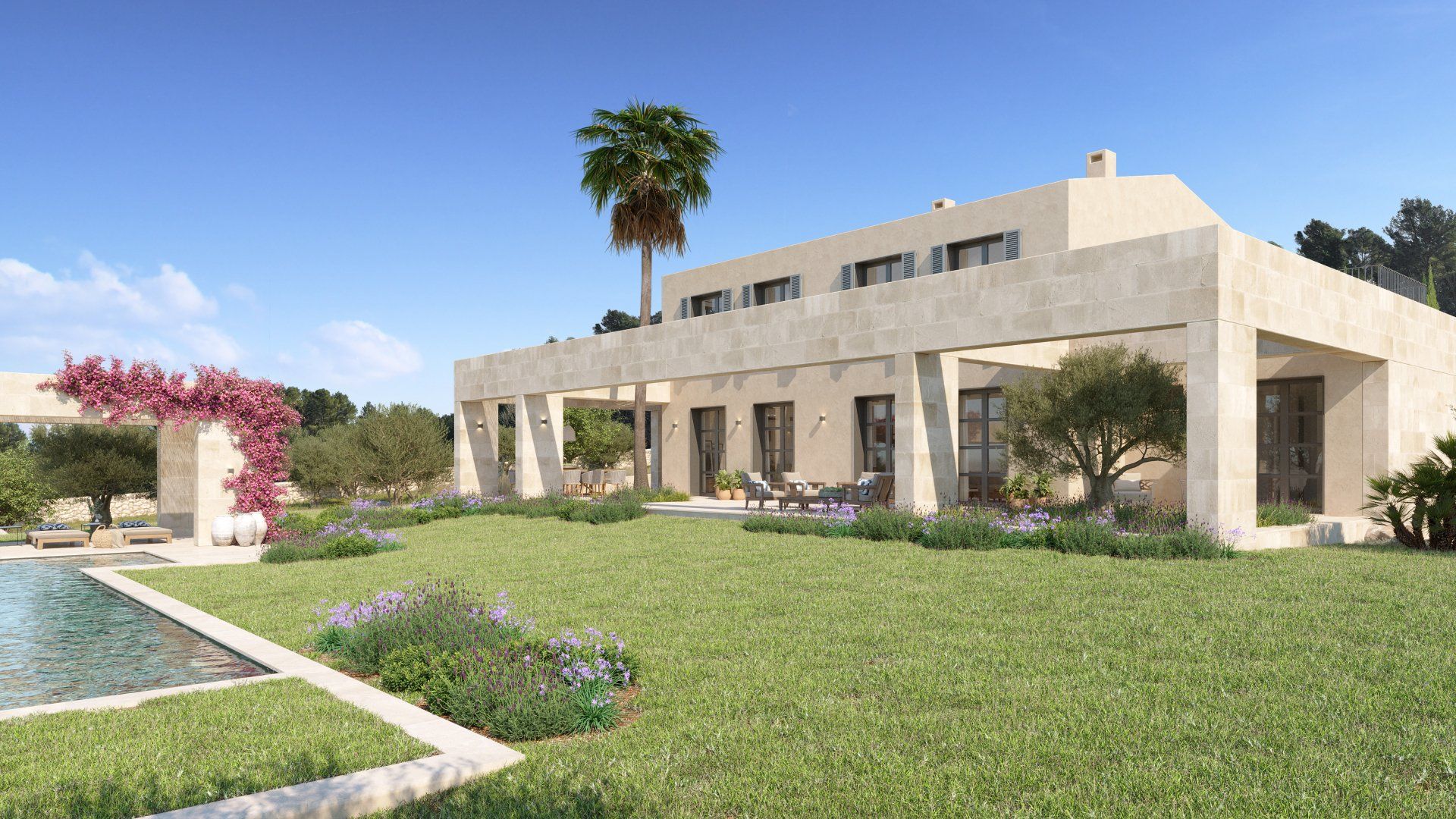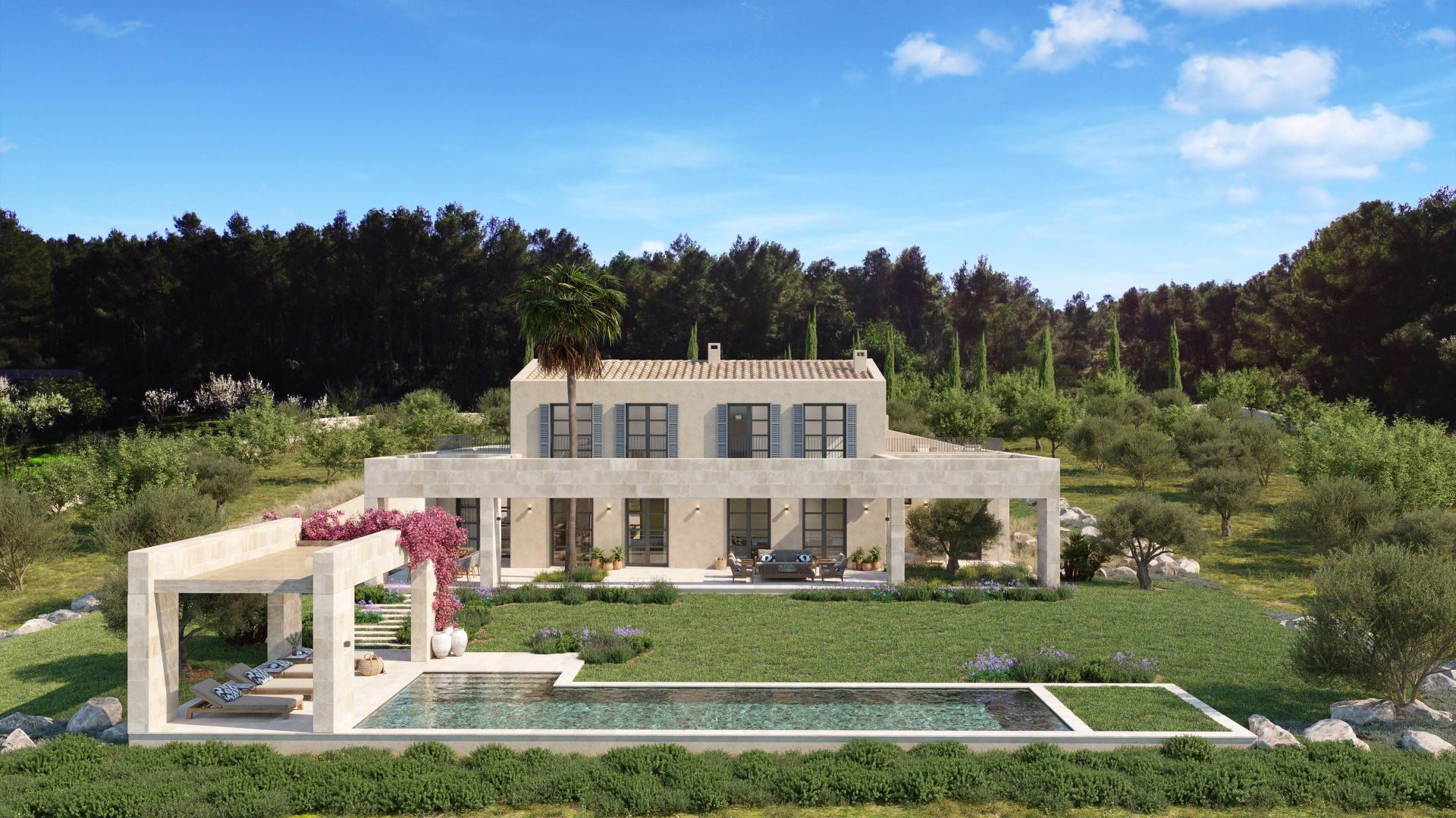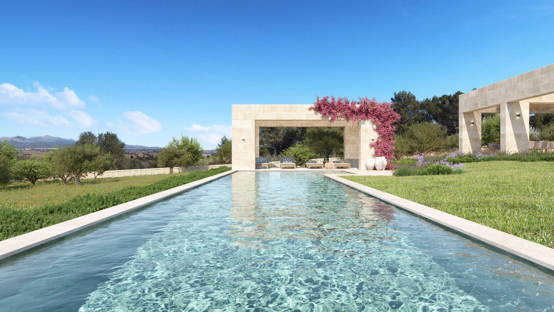 Quietly hidden in the country side, just 6 minutes away from the center of the village, Villa Santa Maria will offer spectacular views to the Tramuntana mountain range. The large plot of 15400m2 offers absolute tranquility, in a typical Mallorcan rural atmosphere, while being only 16 minutes away from the center of Palma, and 20 from the international airport.